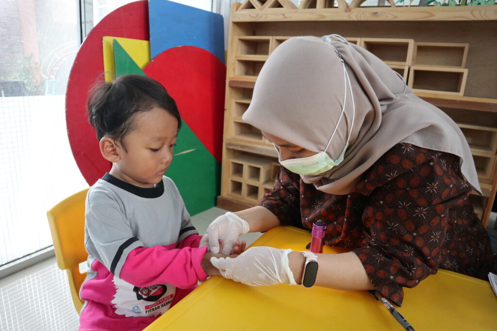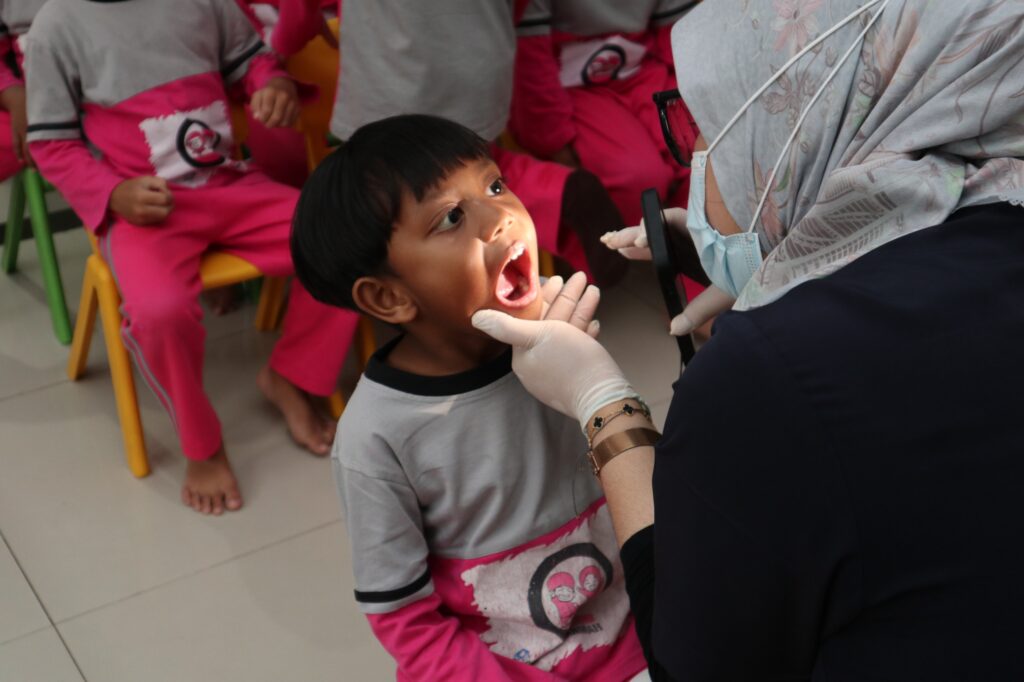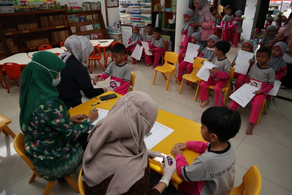 Pesertanya mulai dari baby, toddler, TK A, hingga TK B. Sambil menunggu giliran dipanggil, anak-anak tampak bahagia menonton bersama video edukasi tentang kesehatan mulut. Mereka belajar bahwa menjaga tubuh tetap sehat dan merawat gigi bukanlah hal yang menakutkan, melainkan pengalaman yang menyenangkan.
